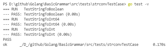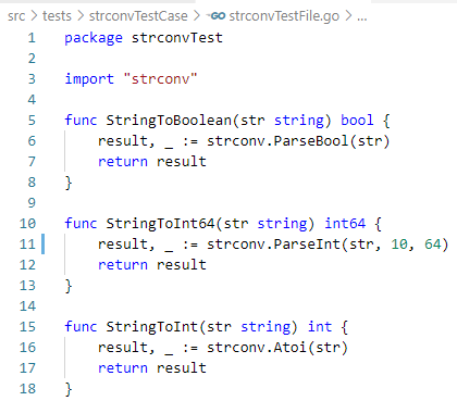 strconTestFile.go 파일은 strcon 모듈을 이용하여 문자열 인자로 받고 반환 타입이 int, bool, int64인 StringToBoolean, StringToInt64, StringToInt 함수를 만들었다.