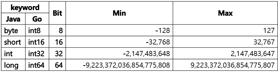 java와 달리 go는 int [8, 16, 32, 64]이런 식으로 자료형의 크기를 나타낸다. 부호가 있는 정수 타입은 bit의 왼쪽에서 첫 번째 bit(msb [most significant bit])는 음수, 양수를 표현하기 때문에 1이면 음수, 0이면 양수를 표현한다.
