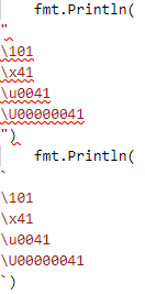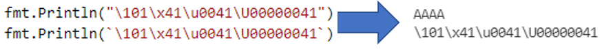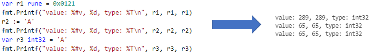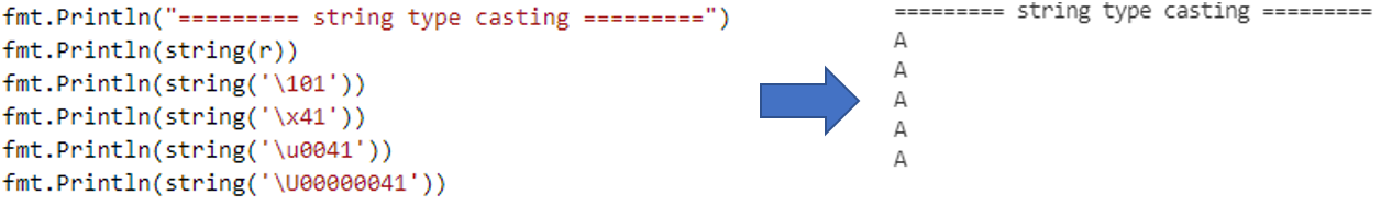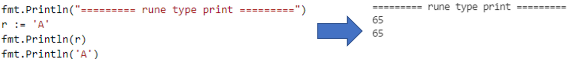 그냥 rune type은 개발자가 이해하기 편하게 가독성 측면으로 만들어 놓은 것 같다. rune type의 값으로 작은따옴표('A')에 문자 한 개를 넣어 사용할 수도 있지만 역슬래시(\)를 접두사로 값을 시작하면 유니코드 문자가 아닌 코드로도 표현할 수 있다. 영어 대문자 A를 출력하려면 8진수 \101, 10진수 65, 16진수 \x41, 작은 유니코드 포인트 \u0041, 큰 유니코드 포인트 \U00000041과 같이 출력할 수 있고 \n, \t와 같은 이스케이프 문자도 지원한다.