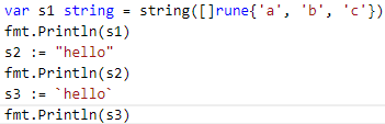 string 타입은 초기화 값을 크게 두 종류로 나눌 수 있다. 큰따옴표("")와 역 따옴표(``) 안에 문자들을 나열하는 것과 rune 타입의 배열을 string 타입으로 형 변환하는 방법을 사용하여 초기화할 수 있다.