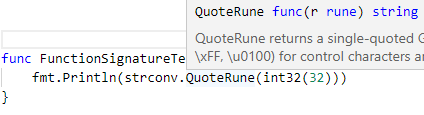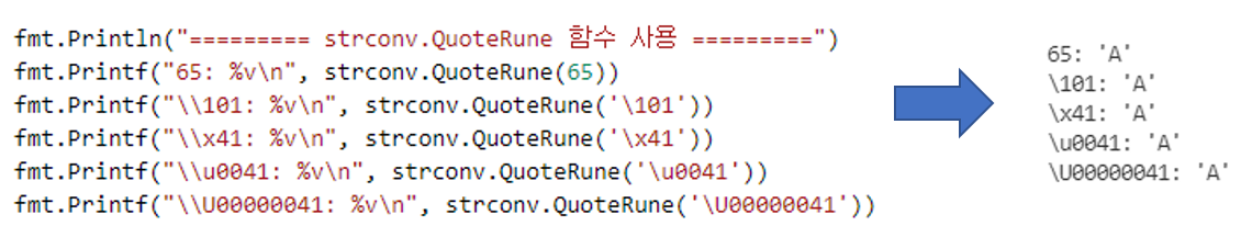 string(65)도 출력하면 A가 출력되지만 IDE에서 주위 표시를 뿜! 뿜! 한다. 다음 두 번째 방법은 strconv 패키지의 QuoteRune 함수를 사용하는 방법이다.
