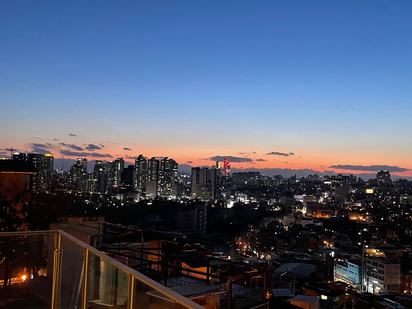 맛있는 피자와 피클을 우걱우걱 먹고(사실 감자튀김도 먹었는데 맛이 별로 여서 패스~) 디저트로 커피를 먹으러 아주... 멀리 갔는데 해방촌 근처에 있는 오리올이라는 곳이 목적이었지만 너무 춥고 오르막길을 걸어서 비몽사몽 해지고 너무 힘들었다.. 그래도 풍경이 너무 이뻐서 손을 덜덜 떨면서 사진은 남겼지만 ㅋㅋ