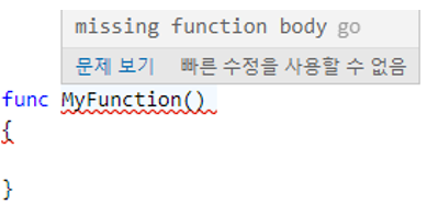 주의할 점은 C 계열 언어처럼 scope의 시작점과 func 예약어가 다른 줄에 위치하면 에러가 발생한다.