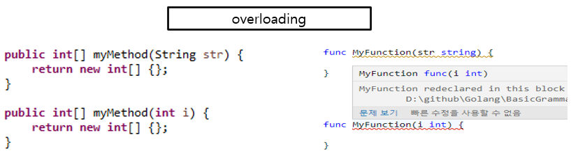 사실 method signature를 이야기하면 overloading(오버 로딩)은 당연하듯 뒤 따라오는 주제이다. overloading을 간단히 설명하면 함수명이 같고 parameter list의 형태를 다르게 만드는 것을 뜻한다. Go를 공부하면서 엄청 놀랍게 느껴지는 몇 가지들이 있었는데 함수 부분에서도 있다. 그것은 바로 overloading을 지원 안 한다는 것이다.