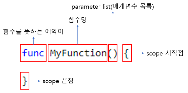 하지만 오늘 주제는 signature이기 때문에 다 필요 없고 함수명과 parameter에 초점을 맞추면 된다. Go에서 함수를 선언하는 방법은 func 예약어로 시작하여 중괄호({})로 끝난다. 보통 중괄호를 scope(스코프)라고 말하니 이제부터 중괄호를 scope라 하겠다.