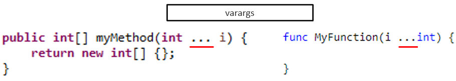 parameter list에 parameter가 같은 타입이면서 동적으로 받아야 할 때는 varargs [variable arguments](...)를 이용할 수 있다. 문법은 Java랑 Go랑 같은데 거의 모든 언어에서 ... 를 사용하면 varargs를 뜻하는 것 같다.(Javascript도 똑같음)