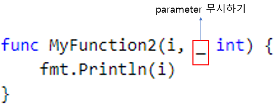 위와 같이 출력된다. Go는 특별한 문법이 있는데 바로 parameter를 생략할 수 있다. _(underbar)를 사용하면 되는데