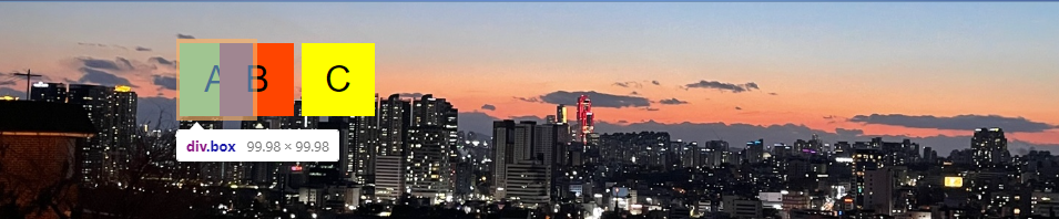 또한 앞에 설명한 이유와 같이 B box의 margin-right property를 -50px로 할당하게 된다면 B box 위에 C box가 위치하게 된다는 것이다.
