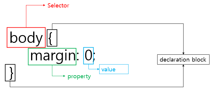 Selector(선택자)의 종류는 여러 가지 있는데 이건 따로 정리하겠다. 가장 중요한 점은 declaration block의 기호인 curly bracket({})과 property와 value를 명시 후 마지막을 알리는 semi-colon(;)이다. semi-colon은 꼭! 꼭! 꼭! 명시하자.