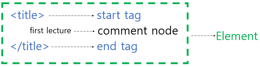 보통 Element와 Tag를 구분 못 하는 사람이 많은데 Tag는 <section></section>, <article></article>과 같이 start tag와 end tag로 짝지어 사용하는 Tag 또는 <img />, <input />과 같이 start tag로만 구성된 Tag로 크게 두 형태가 있다. 짝지어 사용하는 Tag인 경우 children element(하위 요소)들을 가질 수도 있고 Text Element라고 불리는 요소들도 가질 수 있는데 start tag와 end tag 사이에 있는 모든 하위 요소들을 통틀어 Element라는 용어를 사용한다.