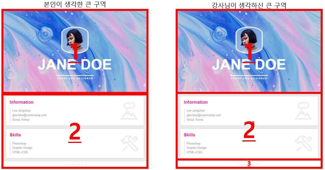이건 작업하기 나름이라며 실무에서 겪는 trade off(트레이드오프)라 하셨지만 본인은 설득당했다. 그 이유는 header, body, footer처럼 세 개의 큰 구역을 나눈 후 작업하는 게 좋다.라는 말씀을 반박하기 어려웠다. 궁금해서 어느 웹 사이트를 참조해도 큰 구역을 세 개로 나누는 게 두 개로 나누는 것보다 많은 것 같다.
