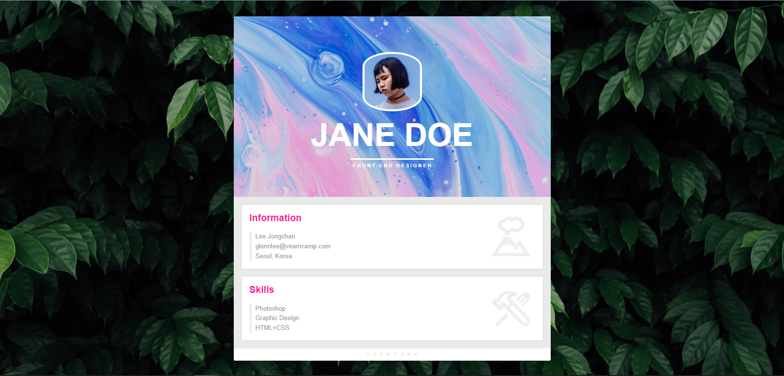왜냐하면 본인 기준에 가장 큰 틀은 body 요소라 생각했기 때문인데 강사님 기준에선 body의 background-img는 세부적인 내용이고 가장 큰 틀은 프로필 내용을 감싸고 있는 가운데 정렬된 컨테이너(container)라 하셨다. 이해하기 난해할 수 있으니 이미지를 첨부하겠다.
