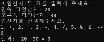 간단하게 main함수에서 계산하기 전 입력된 operation이 4번이거나 5번인 경우 rightOperand가 0이면 계산을 하지 않고 연산할 수 없다는 메시지를 result에 대입하였고 조건이 거짓이면 계산할 수 있도록 else를 사용했다. else는 if문과 else if문의 조건식들에 부합하지 않은 경우 무조건 실행되는 영역이다.