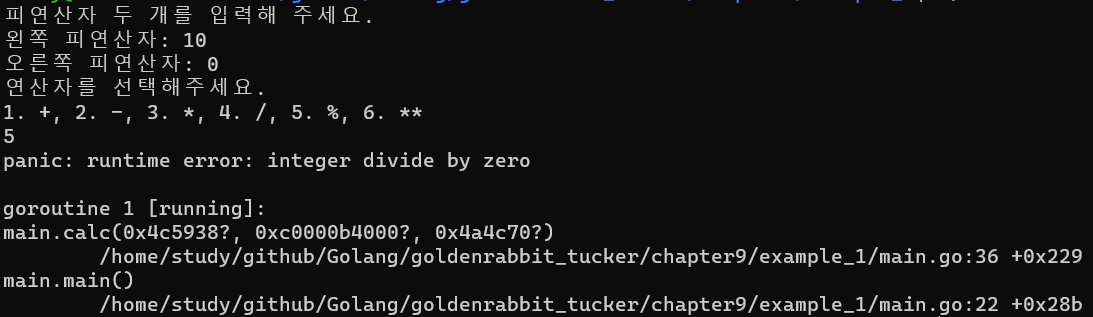 위 이미지처럼 예외(panic)가 발생하지 않고 간단하게 예외처리를 할 수 있게 됐다. 하지만 이렇게 수정하더라도 연산자를 6으로 입력한 경우에는 원치 않은 동작이 작동하게 되는데