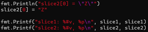 위 코드를 보면 slice1의 1부터 2 - 1까지 요소를 잘라서 slice2를 만들고 출력하는 코드인데 출력 내용을 보면 포인터가 다르다는 것을 알 수 있다. 이게 실수하기 좋은 내용이 있는데 slice2의 0번째 index에 값을 변경하면 slice1에도 영향을 준다는 점이다.