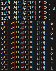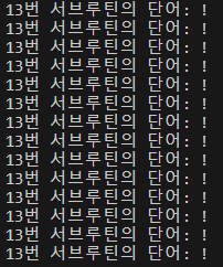 결과는 위 이미지처럼 출력되는데 이유는 서브루틴들이 실행되는 시점의 힙메모리영역의 index와 at은 마지막인 13와 !로 저장돼 있고 서브루틴들은 생성 시점과 다른 마지막으로 저장된 시점의 index와 at을 사용하기 때문에 힙메모리가 아닌 스택메모리에 저장하도록 코드를 수정해 보면