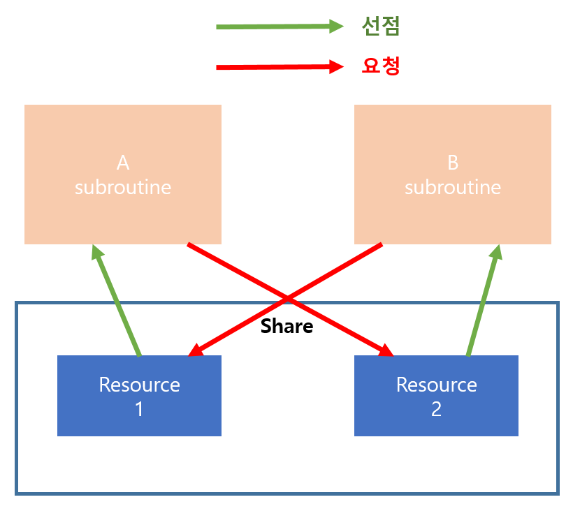 책에는 예제로 설명하지만 본인은 말로 설명하겠다. 뮤텍스를 통해 서브루틴들 중 한 서브루틴은 공유 자원을 선점할 수 있게 됐다. 공유 자원을 선점한 서브루틴이 추가로 다른 공유 자원을 선점해야 하는 상황이 되면 데드락(deadlock)이 발생할 수 있는 상황이 생긴다. 무조건 발생하는 것이 아닌 상황이 만들어지는 거고 A라는 서브루틴과 B라는 서브루틴이 각자 공유 자원을 선점했을 때 A와 B 서브루틴이 서로 선점한 공유 자원을 요청할 때 데드락이 발생한다.
