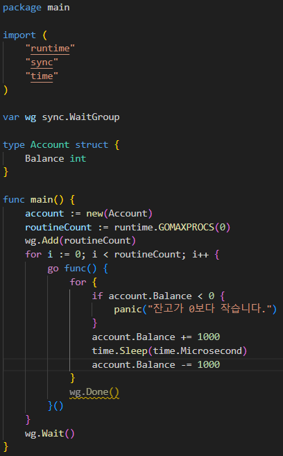 위 코드를 보면 account라는 공유 자원을 여러 서브루틴에서 접근하고 있다. 처음에 잔고를 1000을 더한 후 잠시 쉬었다 잔고에서 1000을 빼는 간단한 로직인데 만작 잔고가 0보다 작을 경우 panic을 발생시킨다. 단순히 생각하면 무조건 1000부터 잔고에 더한 후 1000을 빼니 panic이 발생하지 않을 것 같지만 테스트해 보면 무조건 발생한다. 이런 상태를 데이터 경쟁 상태(data race condtion)라 하고 account.Balance에 접근하고 있는 코드 영역을 임계영역(critical section)이라 한다. 이제 결과를 빨리 보기 위해