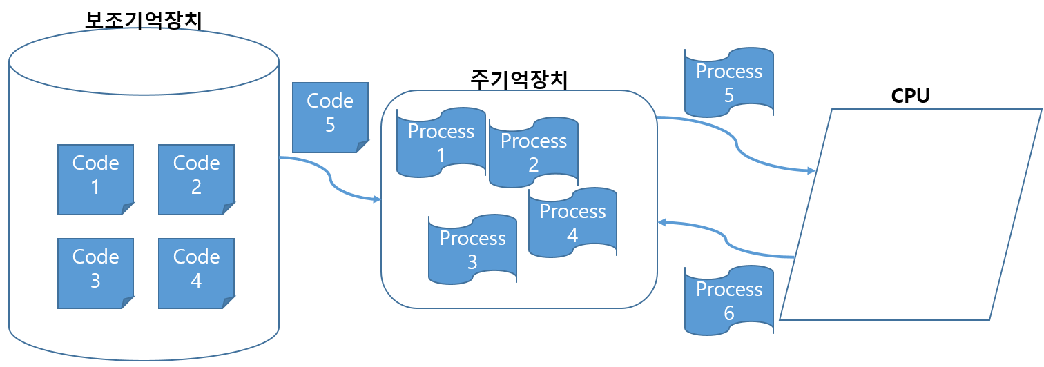 고루틴을 이해하기 앞서 프로세스를 이해하면 좋을 것 같다. 프로세스는 보조기억장치에 저장된 프로그램 즉 개발자가 코딩한 파일을 주기억장치(memory) 영역에 올린 후 CPU를 점유를 기다리는 것을 프로세스라 한다.