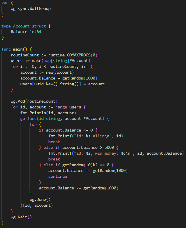 위 예제 코드는 간단한 홀짝 게임이고 보유 금액이 0이거나 작으면 allin이고 5000보다 크면 win money를 출력해 주는 코드이다. uuid로 고유한 id를 만든 후 id의 개수에 맞게 고루틴을 생성해 서로 자기 데이터만 갖고 로직을 처리하기 때문에 데드락을 사용할 필요도 없고 서브루틴끼리 같은 자원을 접근할 이유도 없다. 그러면서 멀티코어 이점을 얻고 있다.