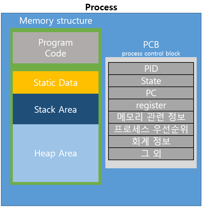 프로세스 구조를 보면 크게 메모리 구조와 프로세스 컨트롤 블록으로 나눠지는데 메모리 구조는 보조기억장치에 있던 프로그램 코드가 기계어로 저장되고 프로그램에서 사용하는 정적 데이터와 스택 영역, 힙 영역으로 구성된다.