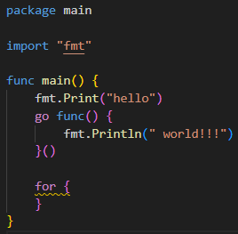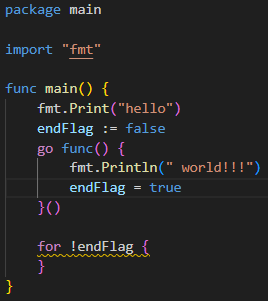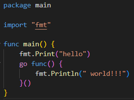 고루틴을 생성할 땐 go 예약어를 사용하며 함수를 호출하는 형태로 사용된다. 리터럴 함수여도 괜찮고 일반 함수여도 괜찮다는 말과 같고 파라미터를 줄 때도 똑같다. 위 이미지의 코드를 빌드 후 실행하면 결과가 어떻게 나올까? hello world!!!가 나올까? hello가 나올까? 답은 hello만 나온다. 이유는 메인루틴이 생성한 고루틴이 끝나기 전에 끝났기 때문인데 이러한 상황을 논 블로킹(non blocking)이라 한다. hello world!!!가 출력되도록 코드를 수정해 보면