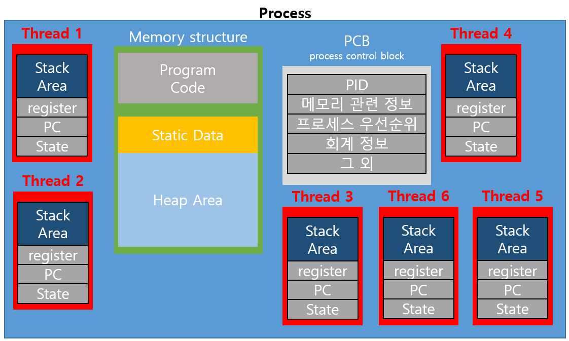 위 이미지는 프로세스 안에 생성된 스레드이며, CPU는 프로세스에서 스레드로 작업 단위가 변경되면서 동시성(concurrency) 효과를 얻을 수 있었다. 참고로 프로세스만큼은 아니지만 스레드 역시 콘텍스트 스위칭 비용이 발생한다.