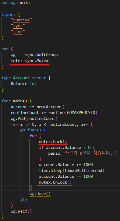 위 코드를 보면 account라는 공유 자원을 여러 서브루틴에서 접근하고 있다. 처음에 잔고를 1000을 더한 후 잠시 쉬었다 잔고에서 1000을 빼는 간단한 로직인데 만작 잔고가 0보다 작을 경우 panic을 발생시킨다. 단순히 생각하면 무조건 1000부터 잔고에 더한 후 1000을 빼니 panic이 발생하지 않을 것 같지만 테스트해 보면 무조건 발생한다. 이런 상태를 데이터 경쟁 상태(data race condtion)라 하고 account.Balance에 접근하고 있는 코드 영역을 임계영역(critical section)이라 한다. 이제 결과를 빨리 보기 위해