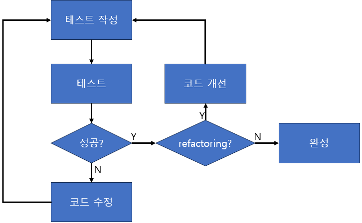 기본 개념은 테스트하기 위한 코드를 작성하고 테스트를 진행했을 때 실패하거나 코드의 개선이 필요한 경우 SOLID 원칙을 기반으로 리팩터링(refactoring) 한 후 테스트를 진행한다. 이때 리팩터링의 결과로 테스트하기 위한 코드를 수정해도 괜찮다. 이 과정을 테스트가 성공하거나 코드를 개선할 필요가 없어질 때까지 계속 반복한다.