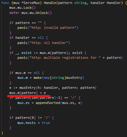 위와 같은 코드가 있을 때 1번과 2번은 작동을 안 한다. 그 이유는 HandleFunc의 구현 함수의 내용을 살펴보면 알 수 있는데 첫 번째 인수인 pattern(path)를 key로 설정하고 두 번째 인수인 로직을 처리하는 함수는 value로 설정하는 map 형태의 데이터 스트럭처를 사용하기 때문에 별표(*)와 같은 특수문자의 기능은 없다.