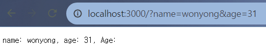 QueryParameter는 주로 Get Method에서 사용하고 몇 가지 재한사항이 있다. browser마다 다른 부분들이 있지만 용량의 제한이 있고 URL이 많이 더러워진다. 즉 URL에 전부 보이기 때문에 사용자의 비밀번호 같은 데이터를 QueryParameter를 사용해 server에 전송하는 것은 충격과 공포이지만 가능하다. 이렇듯 보안에 취약하기 때문에 사용자를 특정할 수 있는 값이나 보안을 중시해야 하는 데이터인 경우에는 사용하면 안 되고 노출해도 문제없을 만한 간단한 데이터를 전송하기엔 좋다. 형식은 key=value로 이뤄지고 첫 QueryParameter는 ? 기호를 사용하고 아 후 QueryParameter들은 & 기호를 사용하여 구분한다. 예를 들면 scheme://host:port/path?name=wonyong&age=31 형식이고 value들은 전부 문자열로 취급되기 때문에 age(key)의 value인 31은 정수가 아닌 문자열임을 잊으면 안 된다. 이전 예제코드를 조금 수정해서 name와 age라는 QueryParameter를 받아 출력하는 코드로 만들어보자.