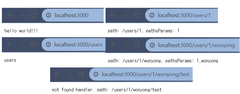 위 코드의 main함수에서 /, /users, /users/:id, /users/:id/:name path들을 handlerTable에 Regist 하고 routing 함수에서 path를 handlerTable.GetPathByHandlerFunc 함의 인자로 넘겨 결과로 알맞은 handler를 호출하고 있다.
