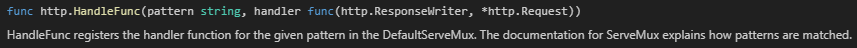 path라 하면 더 이해하기 쉬울 것 같았는데 헷갈릴 수 있으니 보강하면 앞서 설명한 URL에서 path가 여기에서 말하는 path이다. HandleFunc 함수의 정의에는 pattern이라 나오기 때문에 본인은 더 헷갈렸다.