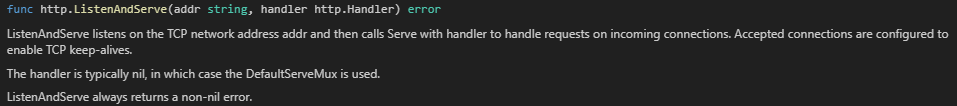 ListenAndServe 함수는 이 앞장에 설명한 SOLID의 SRP를 지키지 못했다. ㅋㅋㅋ;;; 장난이고 여기서 address를 넘겨주는 부분에 host정보 없이 host와 port를 구분하기 위한 콜론(:)과 port만 넣어줬다. 기본 host는 localhost를 사용한다. multiplex는 책에 나온 내용이라 multiplex라 했지만 함수의 정의에는 handler라 나와있다.