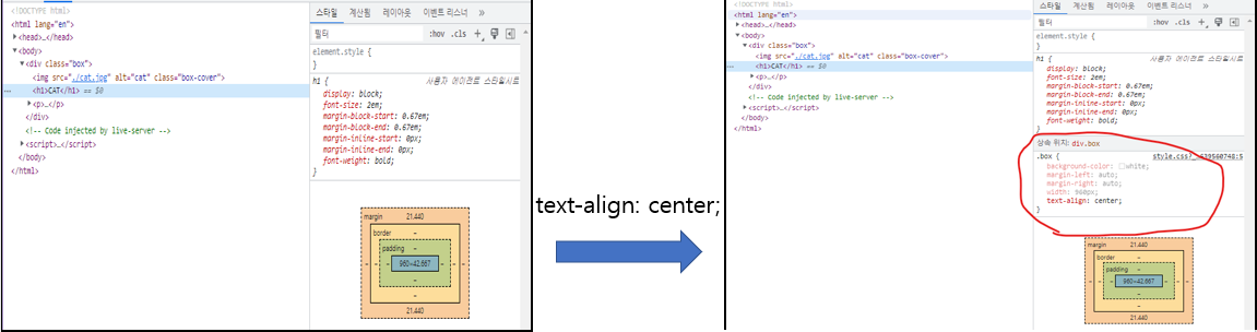 중요한 내용은 div.box의 자식 요소 중 인라인 요소는 img 요소뿐이고 h1과 p 태그 블록 요소인데 가운데 정렬됐다는 것이다. text-align은 블록 요소를 가운데 정렬할 순 없지만 h1과 p 태그의 자식 요소인 text element는 인라인 요소이기 때문에 text-align property의 영향을 받는다.