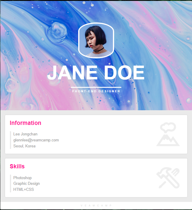 왜냐하면 본인 기준에 가장 큰 틀은 body 요소라 생각했기 때문인데 강사님 기준에선 body의 background-img는 세부적인 내용이고 가장 큰 틀은 프로필 내용을 감싸고 있는 가운데 정렬된 컨테이너(container)라 하셨다. 이해하기 난해할 수 있으니 이미지를 첨부하겠다.