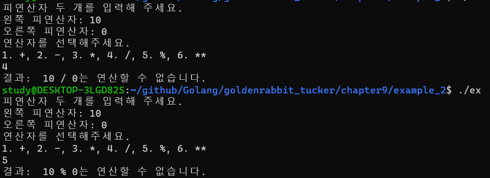 위 이미지처럼 예외(panic)가 발생하지 않고 간단하게 예외처리를 할 수 있게 됐다. 하지만 이렇게 수정하더라도 연산자를 6으로 입력한 경우에는 원치 않은 동작이 작동하게 되는데