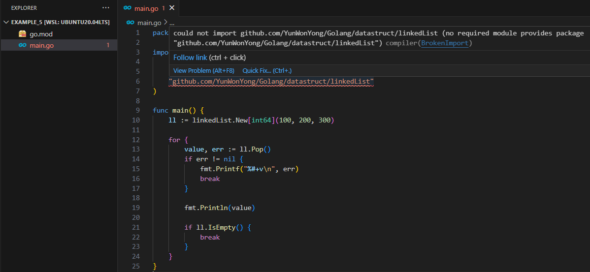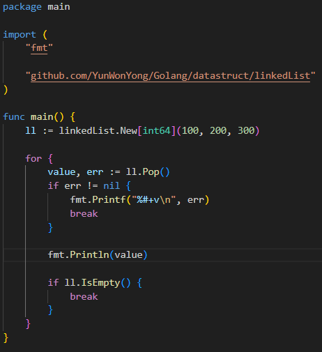 세 번째로 repository root에 go get github.com/YunWonYong/Golang/datastruct 명령을 사용해 다른 곳에서 root를 통해 datastruct를 접근할 수 있게 만든다. (이거 안 하면 datastruct를 못 불러옴)