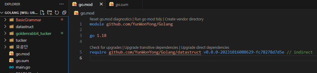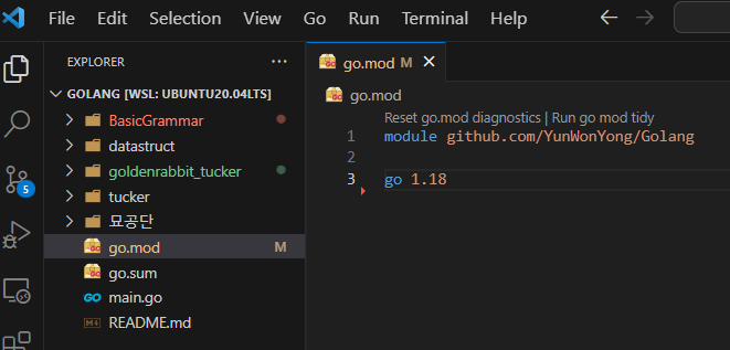 이렇게 import 하는 외부 모듈을 못 찾고 있을 때 커맨드에 go mod tidy를 사용하면