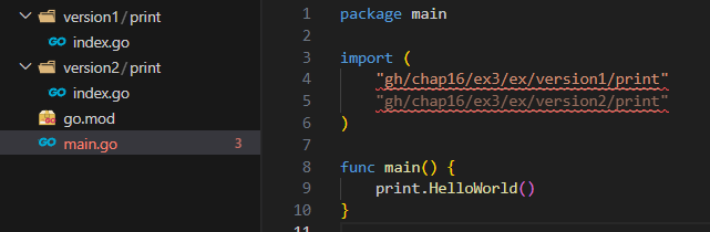 위 코드는 fmt와 strings package를 import 하는 코드이다. 보통 라이브러리들을 갖고 와 사용하는 경우에는 이런 경우가 별로 없는데 우리가 만드는 코드에서는 패키지명이 겹칠 경우가 있을 수 있다. fmt, strings와 같은 패키지는 패키지명 앞에 경로가 없어서 상관없지만 보통은 경로가 있다 이때 사용되는 게 go mod init 할 때 명시한 경로 + 패키지까지의 경로이다. 밑에 이미지를 보면 version1과 version2만 다르고 경로가 똑같다. 사실 폴더를 어떻게 관리하냐에 따라 다르겠지만 여러 라이브러리들을 사용하면서 느낀 점은 경로 마지막에는 거의 패키지명과 같은 폴더를 사용하는 것 같다.